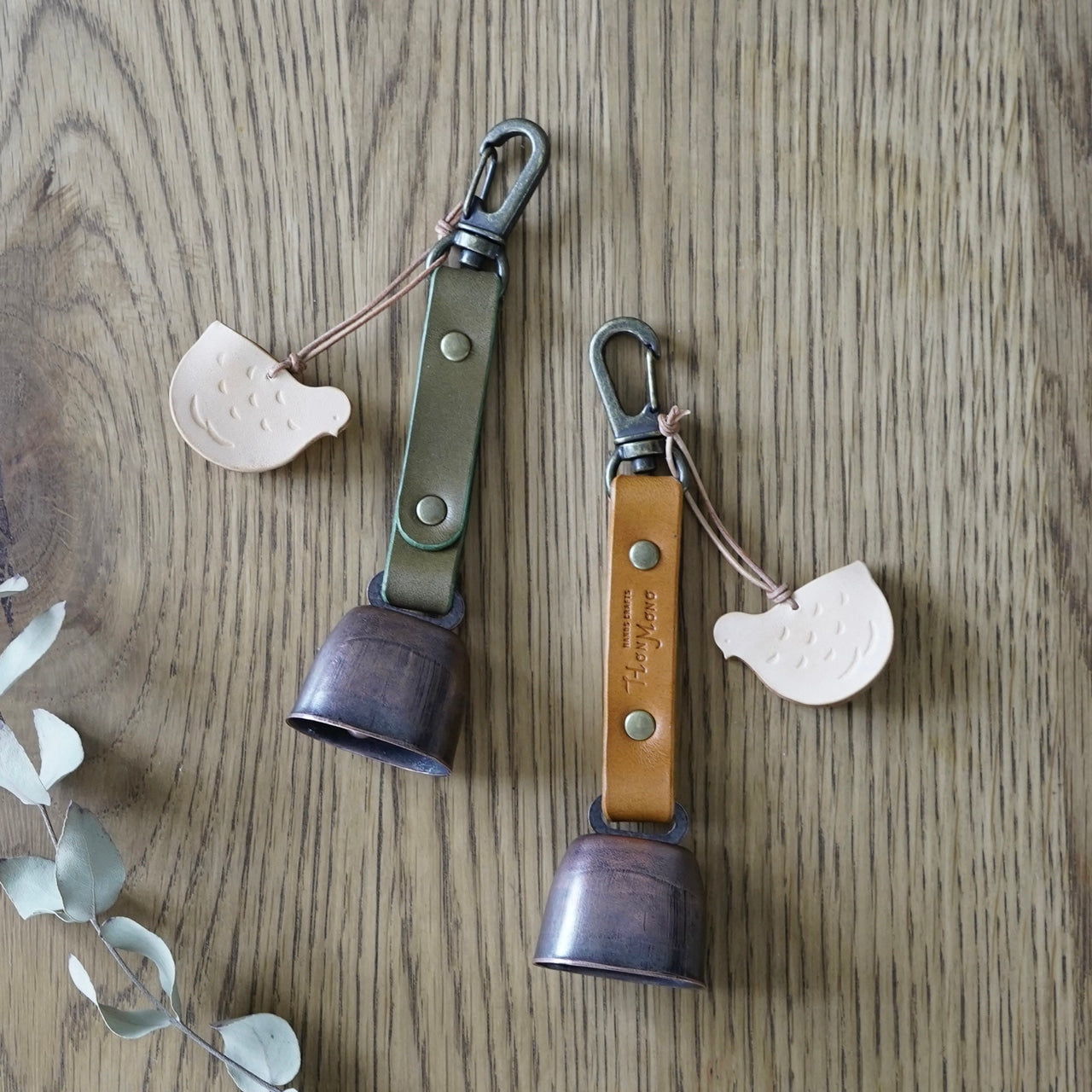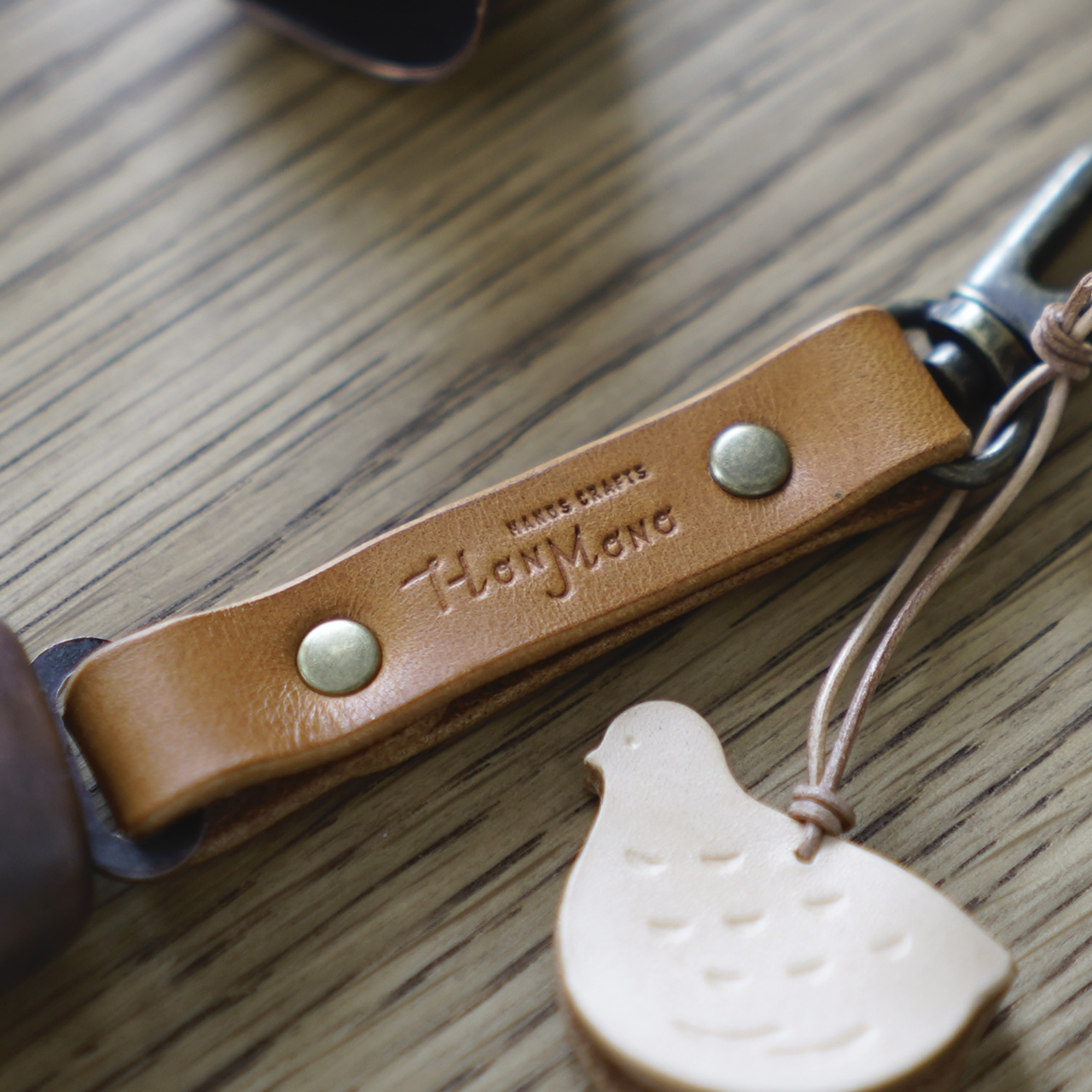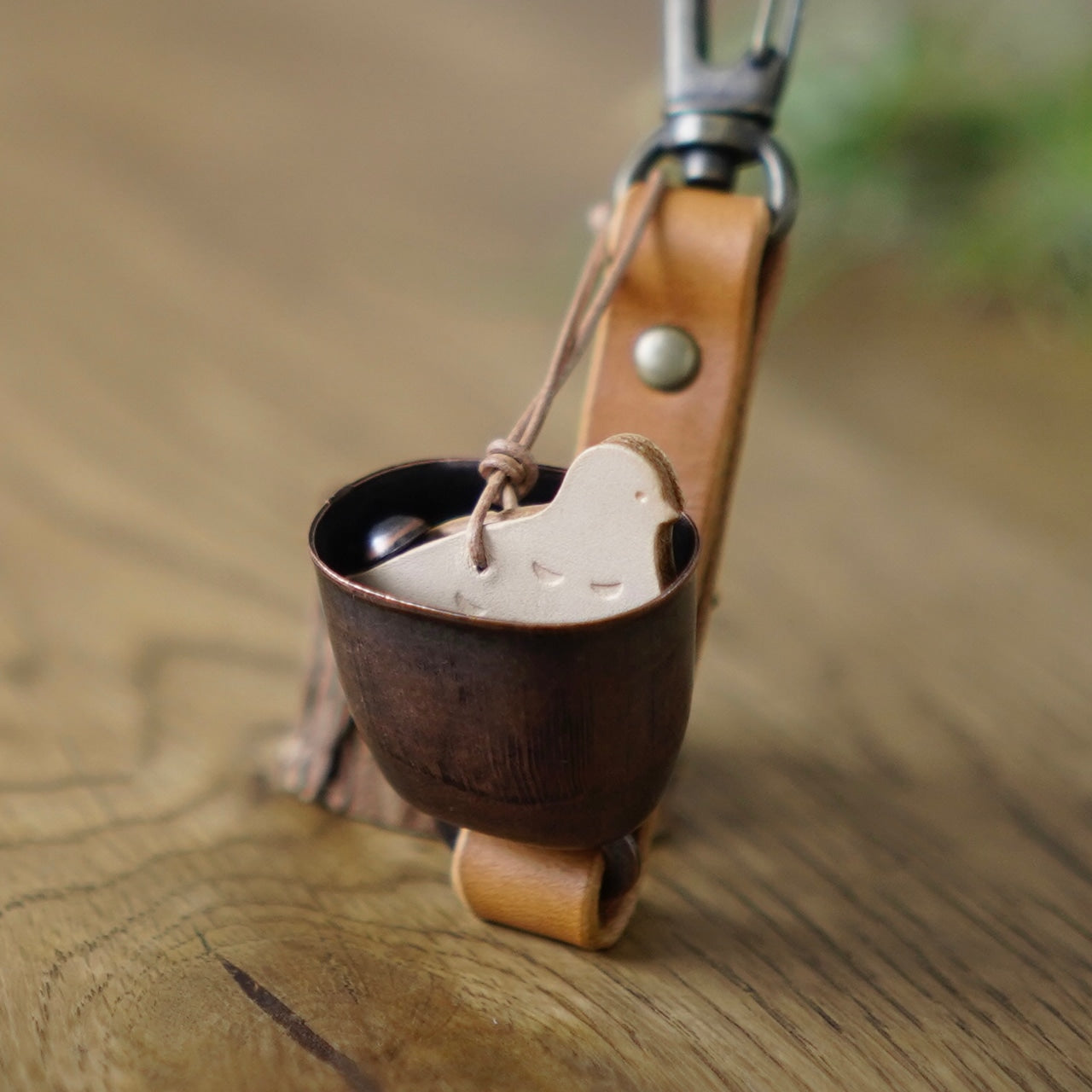 素材は国産の植物タンニンなめし牛革を使用。ストラップ部分は油分を多く含んだ革を使用しており、ある程度の撥水性があります。ライチョウ部分のヌメ革は、革を硬く成形した上で表面をウレタン樹脂コーティングし、耐久性を持たせています。